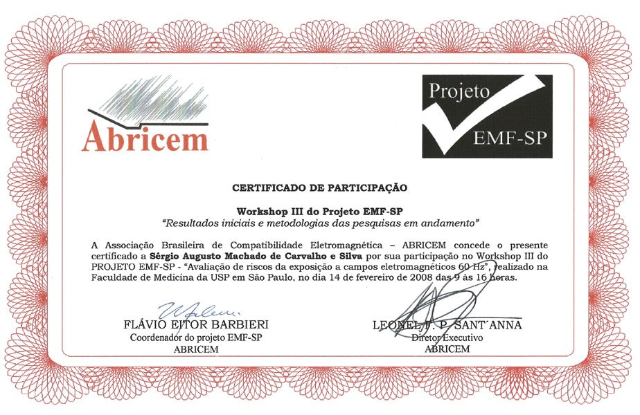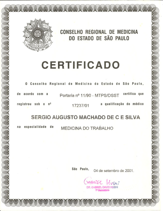 2001 – CRM/SP. Registro de Especialização em Medicina do Trabalho. São Paulo/SP.
