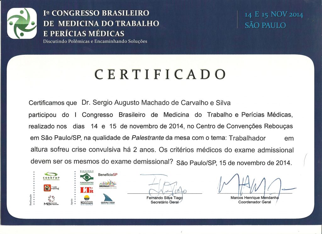 2014 – Palestra no I Congresso Brasileiro de Medicina do trabalho e Perícias Médicas.