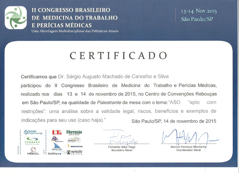 2015 – Palestra – II Congresso Brasileiro de Medicina do trabalho e Perícias Médicas.